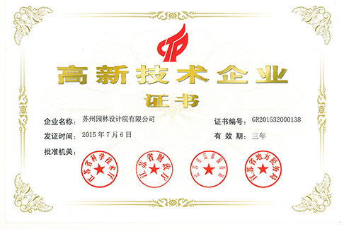 2015年 苏州园林设计院有限公司被认定为江苏省2015年第一批高新技术企业。这是集团第一家高新技术企业。